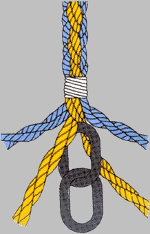 Dann gemäß Spleißanleitung links die Leine in die Kette spleißen. Ich habe dazu das Ende der Kette zwischen 2 Schraubstöcke straff gespannt, so das die Kette beim Spleißen nicht zusammen gezogen wird.