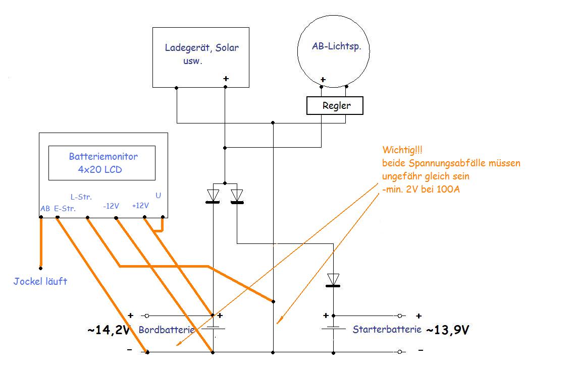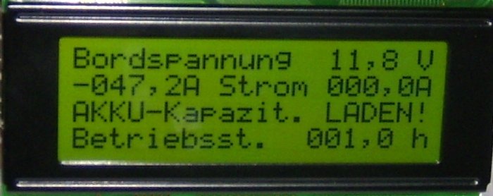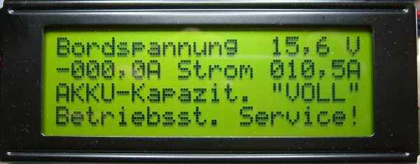 Bordstrom-und Bordspannungsanzeigen werden 2 mal in der Sekunde aktualisiert. Die getrennten Stromanzeigen (Lade-Endlade) haben noch einen weiteren Vorteil, nach Einbau des Bordmonitors lassen sich die Stomanzeigen leicht einstellen, jeweils gemessener Strom und dazugehörige Anzeige einstellen.