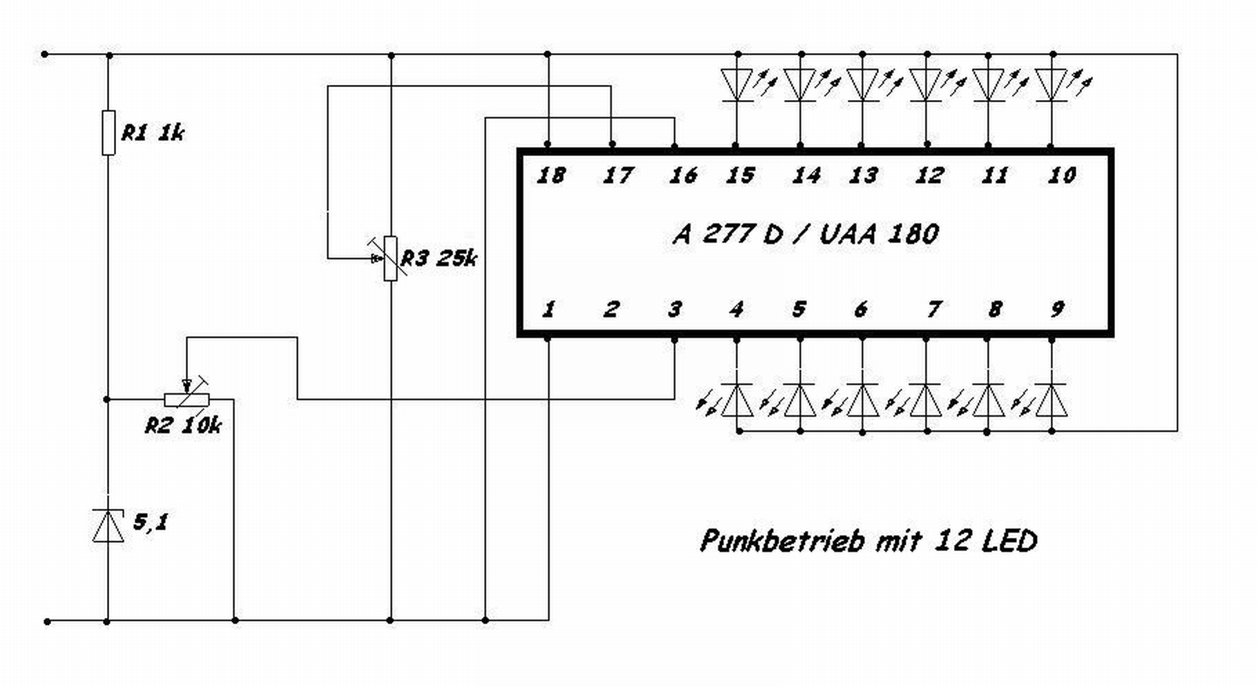Verwendet wurde ein IC aus DDR Produktion (A277D), es gibt aber auch ein Äquivalent von Siemens (UAA 180) mit identischen Werten und Anschlussbelegung, nur etwas teurer. Die Versorgungsspannung kann zwischen 5,5-18V liegen. An Pin 17 wird mit einen Spannungsteiler die Messspannung eingestellt. Über die Z-Diode und dem Poti wird eine immer konstante Referenzspannung eingestellt. Diese Referenzspannung wird dann in 12 lineare Spannungsstufen geteilt und an Pin 4-15 ausgegeben. Wenn man sich die Bereiche anders einstellen will, muss das Poti R1 verstellt werden, dann muss man aber den Spannungsteiler R3/R2 durch ein Poti ersetzen um die Endspannung wieder genau einzustellen.