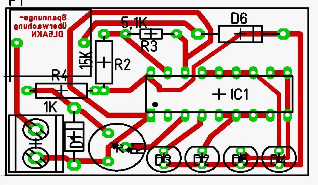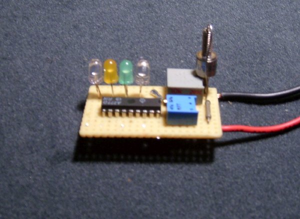 Sie besteht aus 4 Leuchtdioden die im Punkbetrieb arbeiten, das heißt, sie gehen nacheinander an. Dadurch erreichen wir einen sehr geringen Eigenverbrauch der Schaltung, sie kann immer angeschaltet bleiben. Ich habe den Schaltkreis so belegt, dass die linke rote LED von 11,0-12.5V leuchtet, daneben die gelb von 12,5-13,1V, daneben die grün von 13,1-14,3V und die letzte >14,3V. Die Farben habe ich so gewählt rot Unterspannung, gelb Batterie i.O., grün Ladebetrieb und wieder rot Überspannung. Man konnte sofort immer gut den Batteriezustand ablesen, auch von größere Entfernung. Auf Booten und in Wohnmobilen hat man immer seine Batteriespannung im Blick, bemerkt auch gleich defekte Ladeeinrichtung oder starke Verbraucher. Selbst bei meinem Motorrad habe ich die Leuchtdioden unauffällig in den Drehzahlmesser integriert, denn die Ladekontrollleuchte, wenn sie erloschen ist, sagt uns noch lange nicht, dass unsere Batterie auch geladen wird!