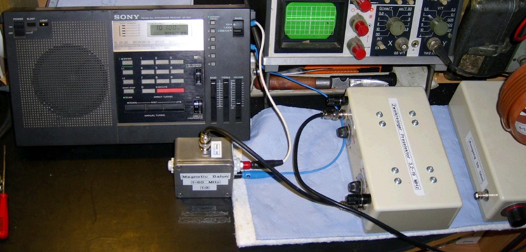 Das meine Antennenanpassung nur für Empfangen an meinen Weltempfänger mehr bringt als dämpft, hat mir dann wunderschön meine Signalstärkenanzeige gezeigt. Im Bereich 3-10 MHz lag der Empfang immer 1-2 Stufen höher, auf alle Fälle nie schlechter als mit einem langen Draht bis zum Empfänger, wie das Benutzerhandbuch von Sony es vorschreibt. Unter 2,2 MHz verwendet der Sony leider seine interne Ferritstabantenne, da gibt es keine Verbesserungen( siehe Teil 3). Über 10 MHz ist auch kaum eine Verbesserung gegenüber der Teleskopantenne zu erreichen. Für meine Versuche hatte ich entweder den Unun oder den Verstärker am Achterstag/Langdraht am Heck. Die Ergebnisse mit Verstärker waren am besten, aber da war ein Betrieb ohne Preselektor nicht möglich.