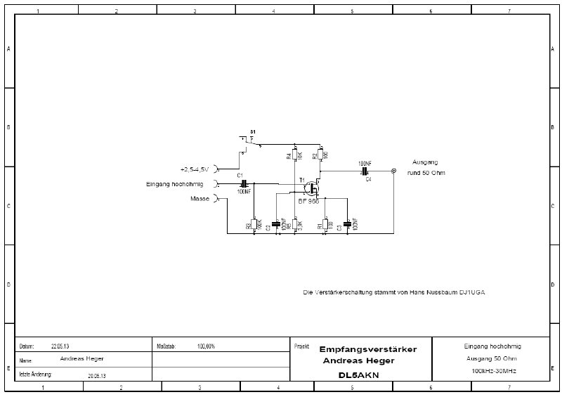 Der Empfangsverstärker eignet sich von 100kHz-30MHz. Die Grundschaltung stammt von Hans Nussbaum DJ1UGA. Der Eingang ist hochohmig. Ich habe als Eingangsbuchse eine SO 239 SH verwendet, dort kann man auch einmal einen Antennendraht mit Bananenstecker anschließen. Für die Versorgungsspannung habe ich einen LiIon-Akku 3,7V 3000mAh 18650 eingebaut, der viele Stunden hält.