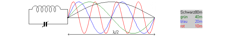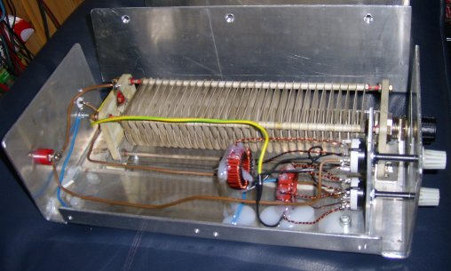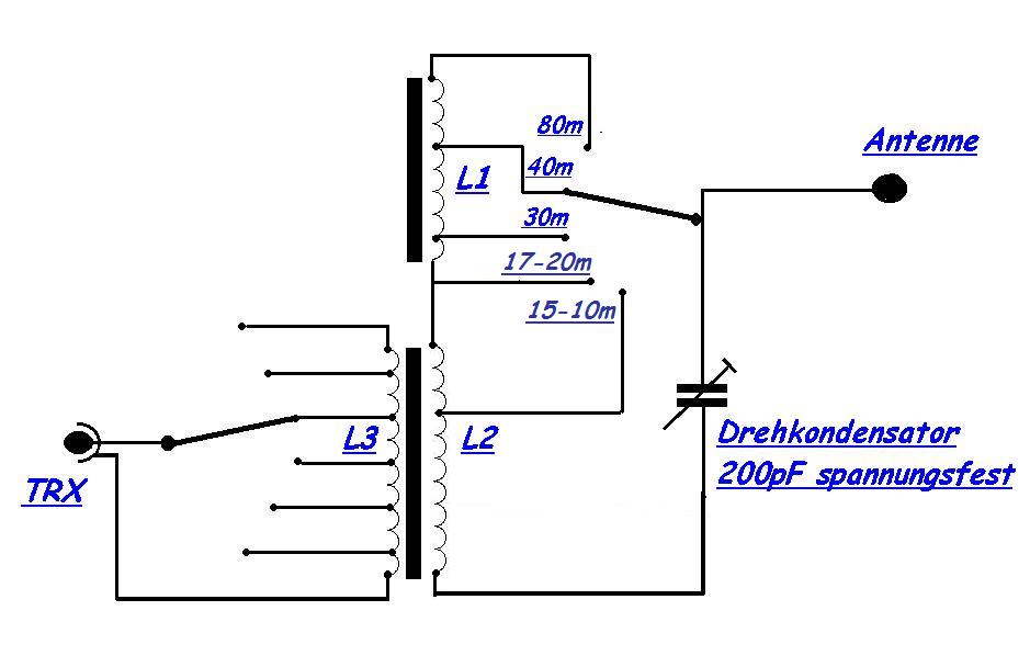 Die Fuchsantenne wird über einen Parallelschwingkreis erregt, der im Resonanzfall hochohmig ist genau wir der Strahlereingang. Eine Fuchsantenne ist immer Lambda/2 oder Vielfache lang. Um alle Bänder abzudecken, habe ich einen 41,7m langen Strahler gewählt. Der Fuchskreis besteht aus einer Spule mit verschiedenen Anzapfungen auf 130-2 Ringkern und einen Drehkondensator mit 200 pF. Der Drehkondensator ist nicht einfach zu beschaffen und sollte mindesten 2 kV spannungsfest sein. Bei ebay sind immer welche im Umlauf. Der Eingang wird dann mit einer 2.Spule, auch auf 130-2 Ringkern induktiv eingekoppelt, mit verschiedenen Anzapfungen zur genauen Einstellung der Anpassung. Die Spulen habe ich mit dem Programm von Erwin Kleitsch DF2SKE berechnet und mit 1mm Kupferlackdraht bewickelt. Die Anzapfungen werden mit Schaltern umgeschalten um die genaue Induktivität zu erreichen und den Eingang anzupassen. Wegen den hohen Spannungen die auftreten können, habe ich immer eine Leerstufe eingefügt. Bei meinen meist kurzen QSO mit einem 100W FT-757, auch mit PSK, ist die Fuchskreisspule kalt geblieben und die Koppelspule meist nur handwarm. Selbst nach einen längern Test mit voller Leistung, konnte ich die Koppelspule gerade noch anfassen (~40°C). Für mehr Sicherheit kann man den T 200-2 verwenden (siehe Tabelle) und dann müsste alles auf einen Ringkern passen. Aus meiner Sicht ist das für mich nicht notwendig!