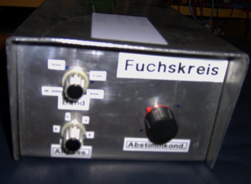 Den Empfänger auf die gewünschte Frequenz einstellen und mit den Schaltern und dem Kondensator das maximale Rauschen suchen. Da muss man etwas Gefühl habe, da dass Rauchmaximum sehr spitz ausfällt, übrigens ein Zeichen, dass unsere Fuchsantenne eine hohe Güte hat. Zum Schluss noch einen Feinabgleich am C mit geringer Sendeleistung und dazwischen geschalteter SWR-Messbrücke.