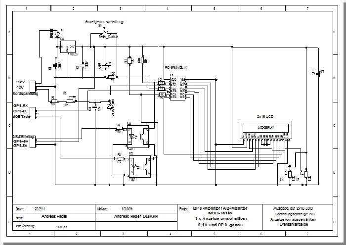 Des weitern habe ich noch einen Eingang vorgesehen an dem eine MOB-Taste angeschlossen werden kann, am besten eine einrastende. Wird die MOB-Taste gedrückt schaltet die Anzeige auf 2 um, aktuelle Position, und die Anzeige wird nicht mehr aktualisiert und kann auch nicht mehr umgeschaltet werden. Jetzt hat man die Möglichkeit die Position des Überbordgegangen zu notieren. Der Controller arbeitet aber im Hintergrund weiter und aktualisiert auch seine Register weiter, wenn man jetzt die MOB-Taste entriegelt hat man sofort ein funktionstüchtiges GPS mit aktuellen Daten zur Verfügung.