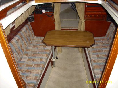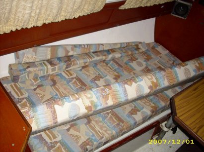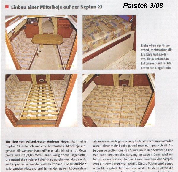 Meine damalige Neptun 22 habe ich auf eine komfortable Mittelkoje umgebaut. Man bekommt eine 1,4m breite und 2,2m/1,85m lange und völlig ebene Liegefläche. Die zusätzlichen Polster habe ich so gebaut, dass sie als Rückenpolster verwendet werden können. Das ermöglicht endlich ein entspanntes Sitzen mit einer passenden Rückenlehne. Es ist alles leicht auf – und abzubauen. Die zusätzliche Teile werden platzsparend hinter den neuen Rückenlehen verstaut.