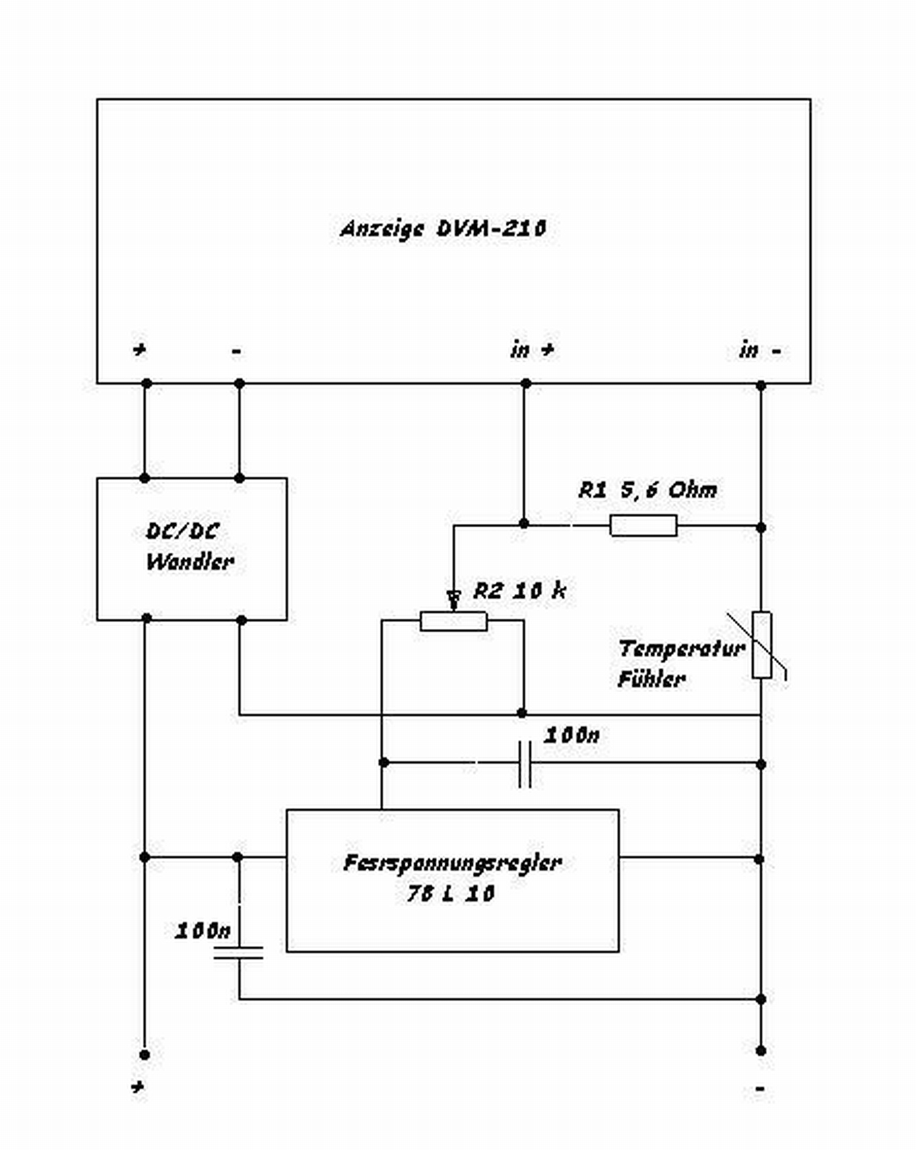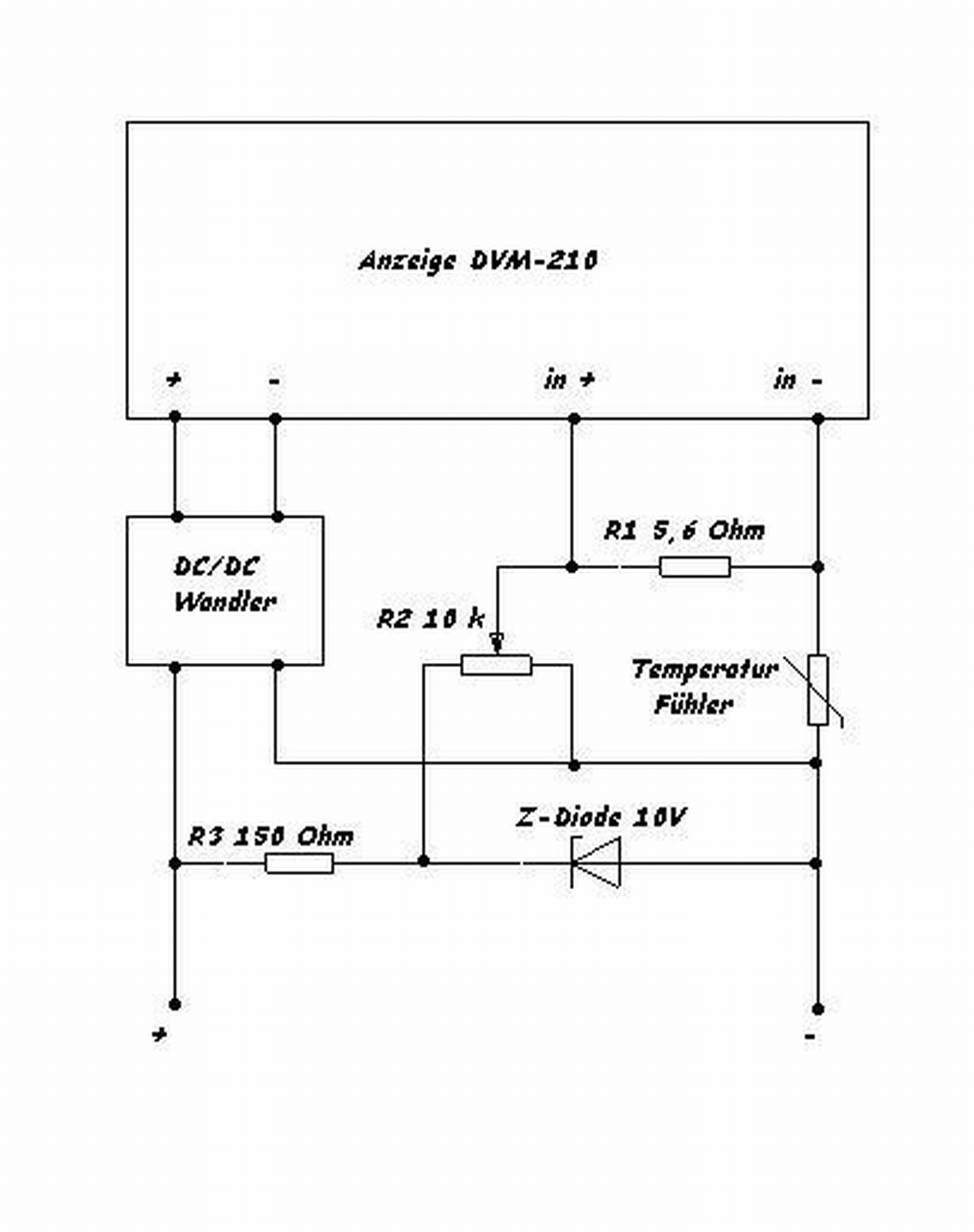 Über den Widerstand R1, der in Reihe ist zum Widerstandstemperaturgeber liegt, lasse ich einen geringen Strom fließen und messe den Spannungsabfall über R1, den ich dann zur Anzeige bringe. Spannungsabfall, Strom und Widerstand sind ja proportional zueinander. Mit dem Spannungsteiler R2 kann die Anzeige abgeglichen, der Nullpunk eingestellt werden. Was ich bei meinen Versuchen gemerkt habe, dass bei einigen Motorenherstellern das Verhältinis zwischen Temperatur und Widerstand nur in einem bestimmten Bereich linear ist, meisten zwischen 60-130°C. Außerhalb dieses Bereichs bekommt man dann eine Falschanzeige. Die Originalanzeige bewegen sich ja auch nur in diesem Bereich. Dann am besten die Anzeige bei Betriebstemperatur abgleichen. Ein weiterer großer Vorteil, mit R2 kann man diese Anzeige auch an alle Widerstandstemperaturgeber verschiedener Motorenhersteller anpassen. Man könnte auch andere Widerstandsthermometer, aber nur NTC verwenden. Um Anzeigenschwankungen durch das Bordnetz auszuschließen, habe ich eine 10V Z-Diode zur Spannungsstabilisierung eingebaut, sie funktioniert aber nur mäßig, da sehr wenig Strom fließt. Besser man verwendet einen Festspannungsregler wie in Plan 2. Wenn man die Anzeige als Zweitanzeige verwendet, ist es besser, zum Entkoppeln eine Diode in die Leitung zum Geber einzubauen.