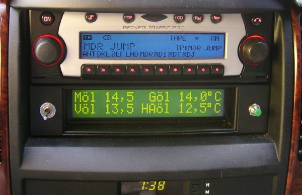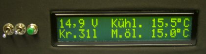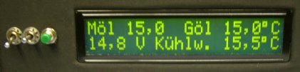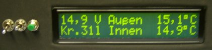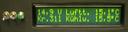 Angezeigt wird alles mit einen 2x20 Dot-Matrix Display. Ich habe ein PC 2002 Display mit 10mm Zeichengröße verwendet. Das Display lässt sich wunderbar im Dunkeln, bei vollem Sonnenlicht und aus verschiedenen Blickwinkeln ablesen.